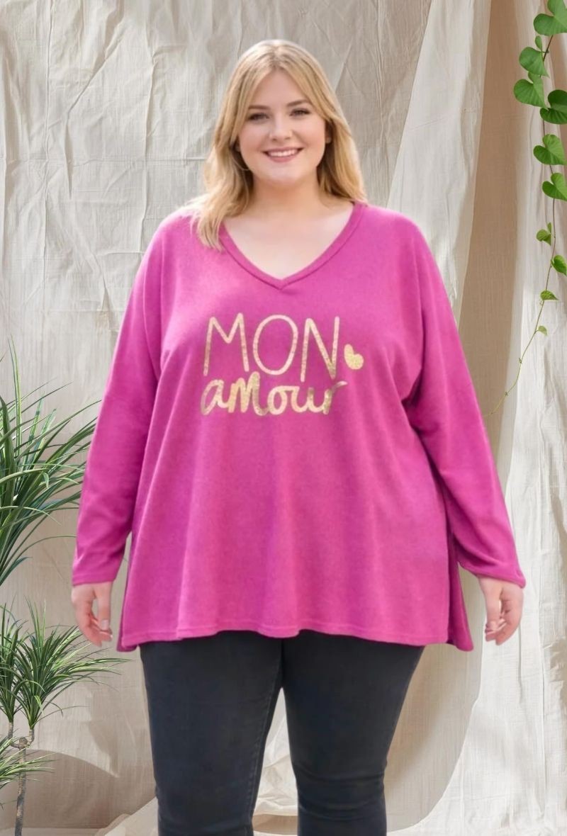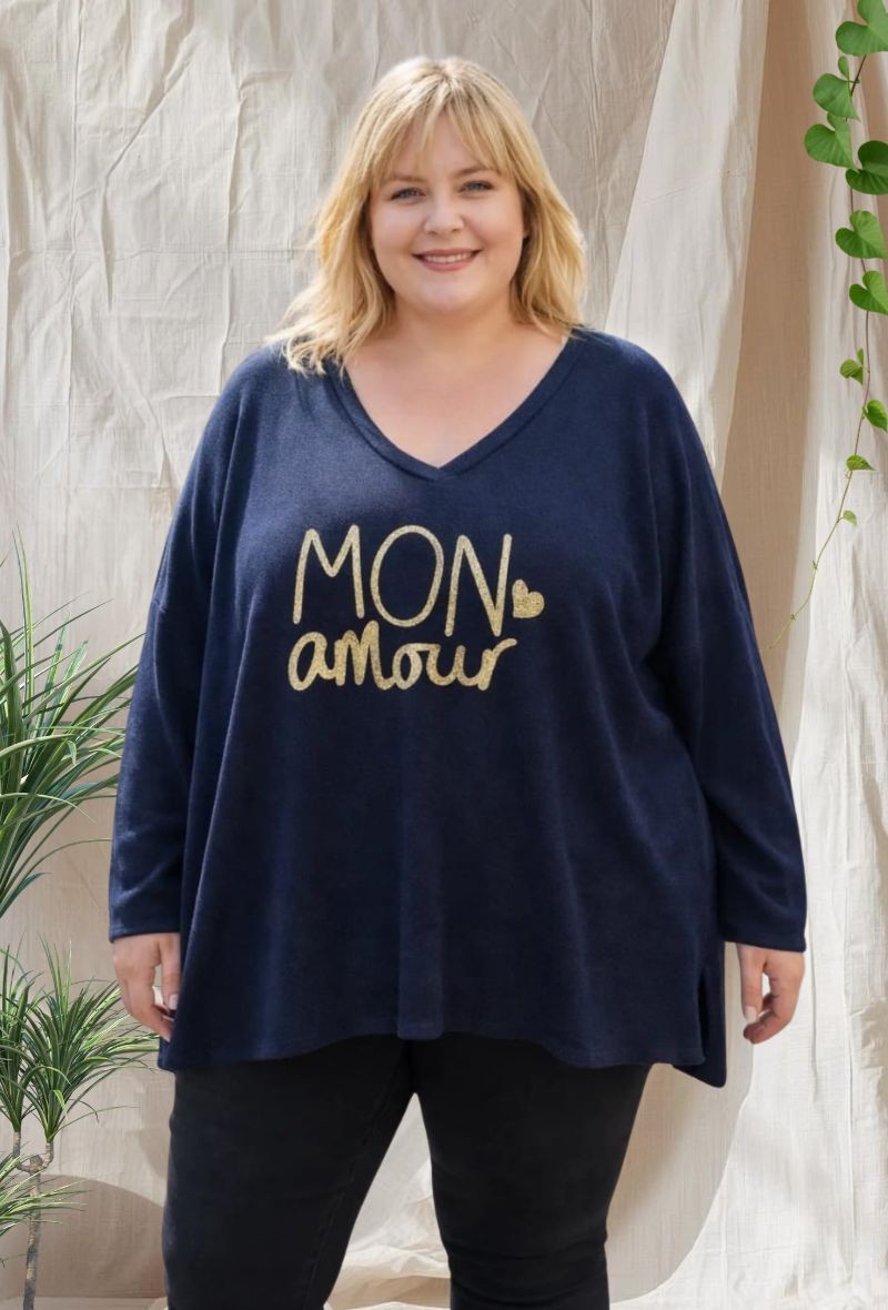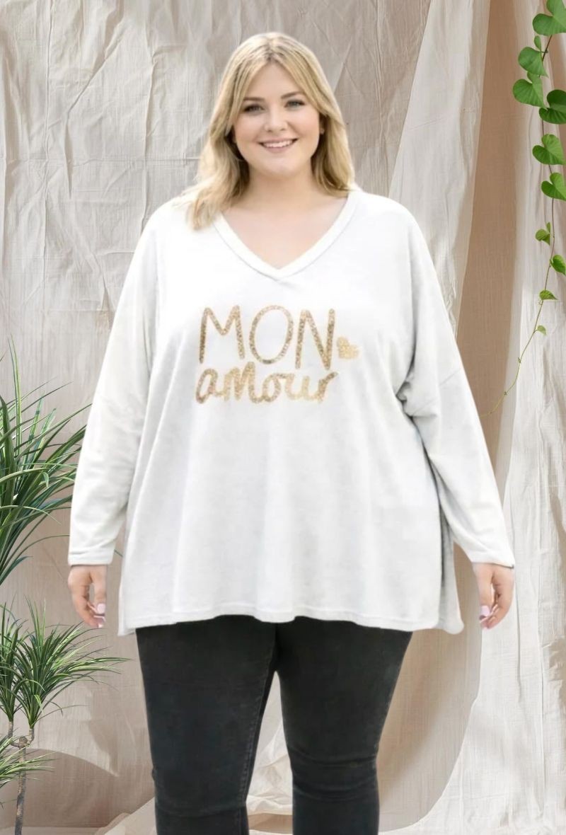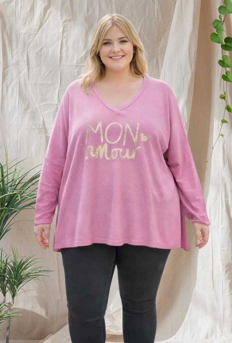 Jersey oversize de punto fino, suave y elástico, con cuello en V y estampado “Mon Amour” con purpurina dorada.