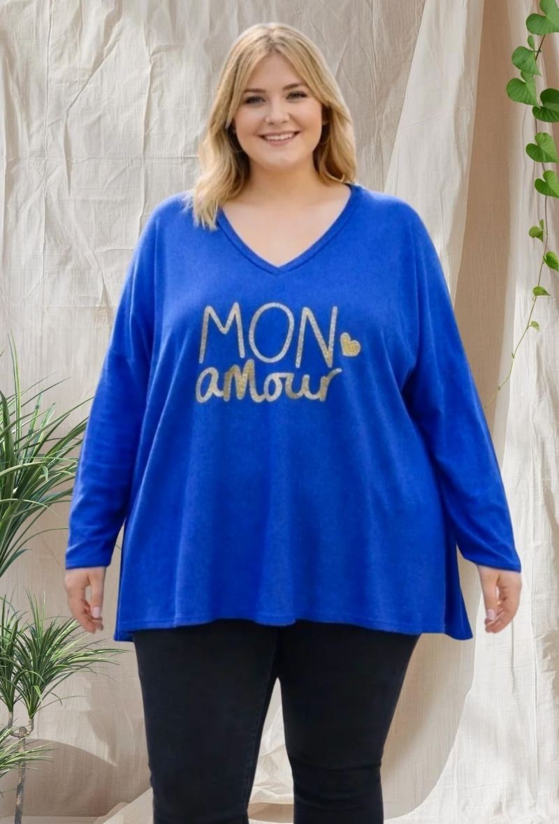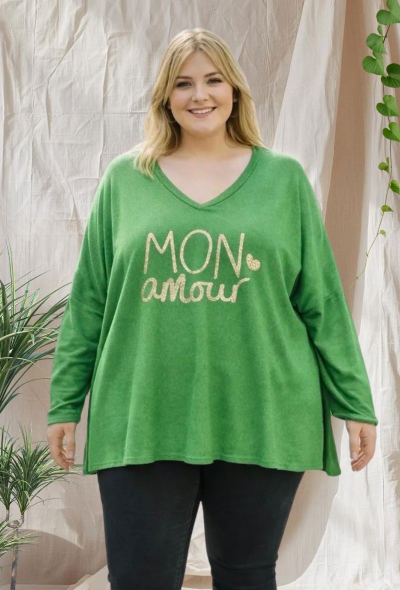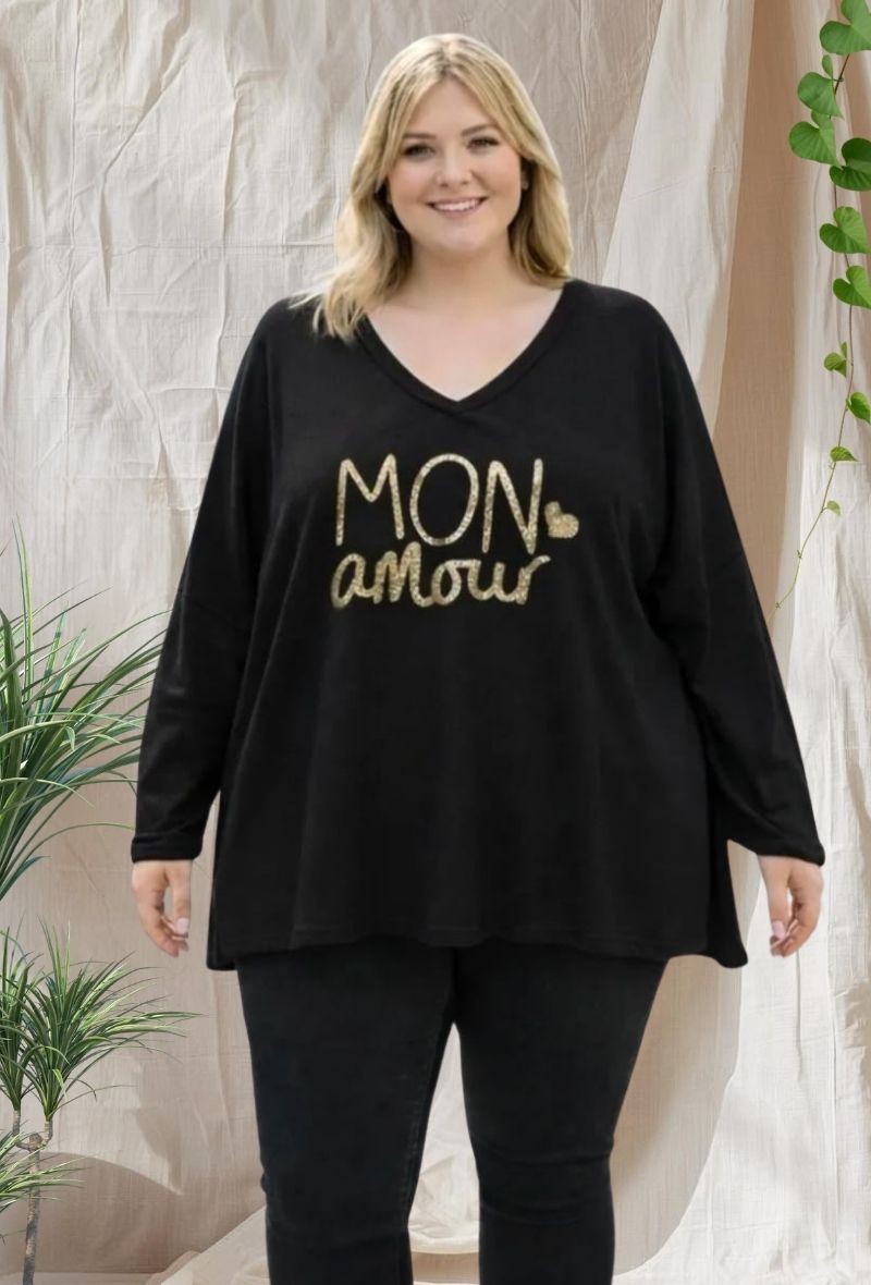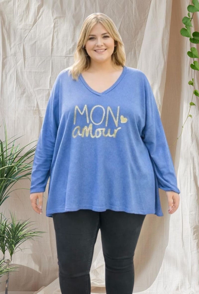 Jersey oversize de punto fino, suave y elástico, con cuello en V y estampado “Mon Amour” con purpurina dorada.