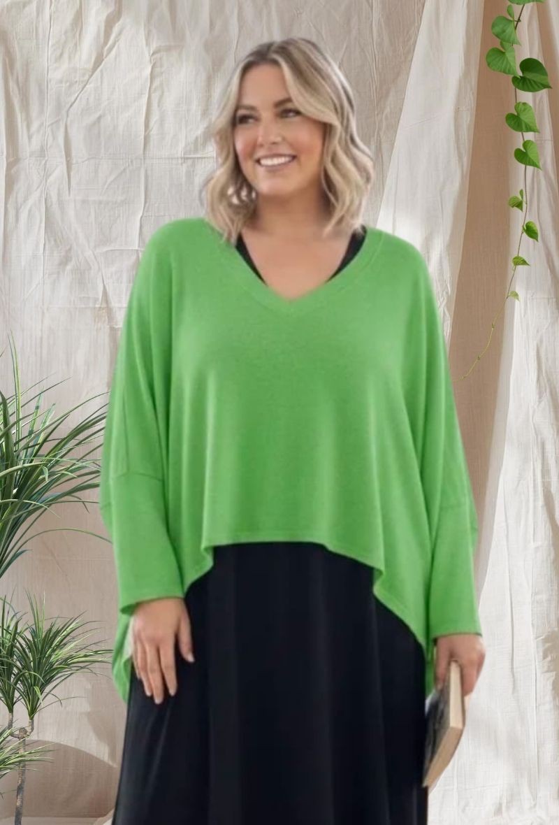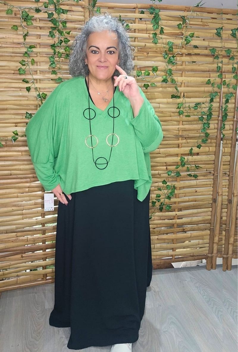 Jersey corto tipo túnica extragrande, de punto suave y elástico, con cuello en V y mangas tres cuartos.