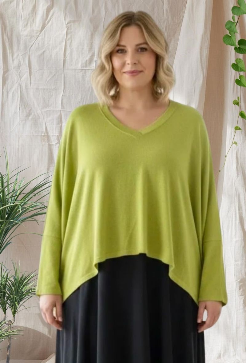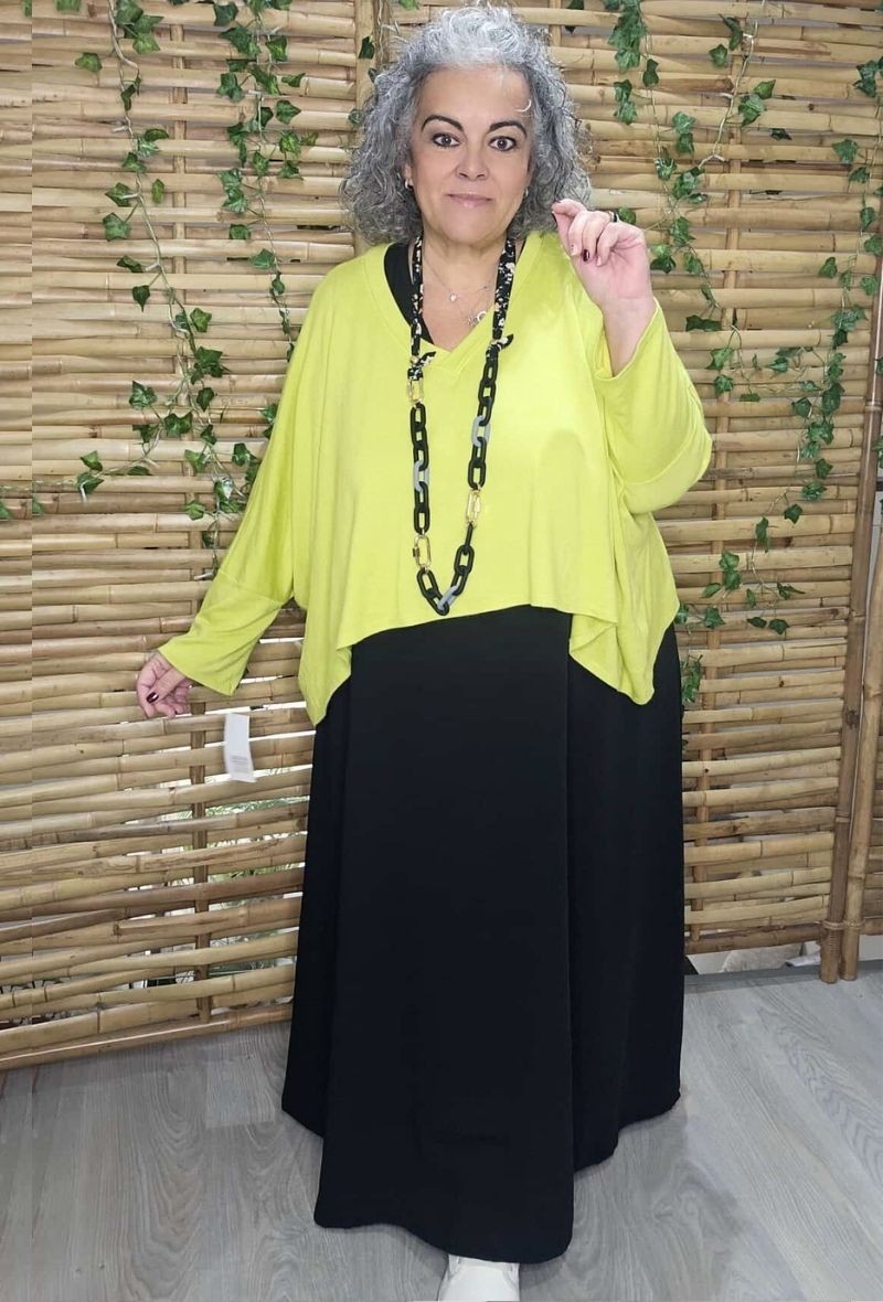 Jersey corto tipo túnica extragrande, de punto suave y elástico, con cuello en V y mangas tres cuartos.