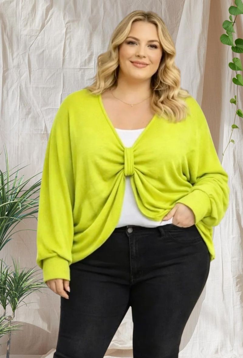 Jersey ligero tipo túnica, de punto suave y elástico, con parte delantera drapeada y fruncida/anudada que estiliza la figura.