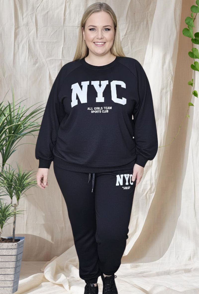Chándal de dos piezas en tejido suave y elástico, compuesto por sudadera con estampado frontal “NYC” y pantalón con cintura elástica y cordón ajustable. Diseño cómodo, ideal para looks casual y deportivos.