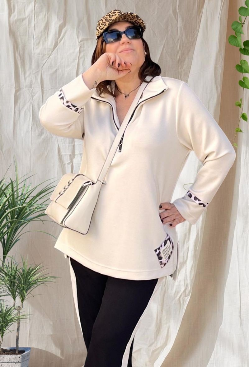 Sudadera lisa con diseño moderno y cómodo, realzada con detalles animal print en mangas y bajo que aportan un toque diferente y actual. Corte recto favorecedor, cuello con cremallera frontal y tejido suave con buena caída. Disponible en dos colores.