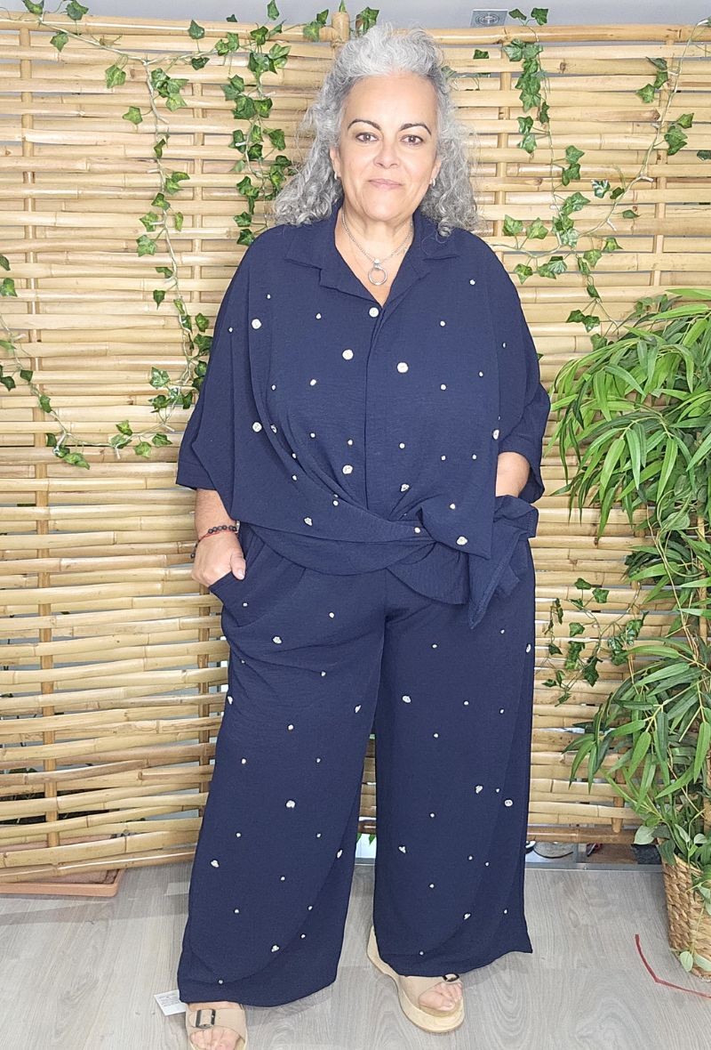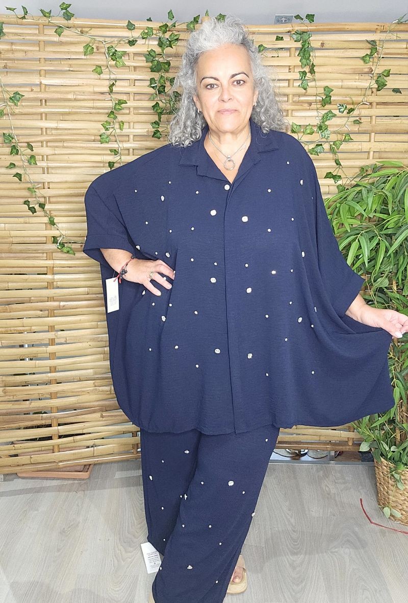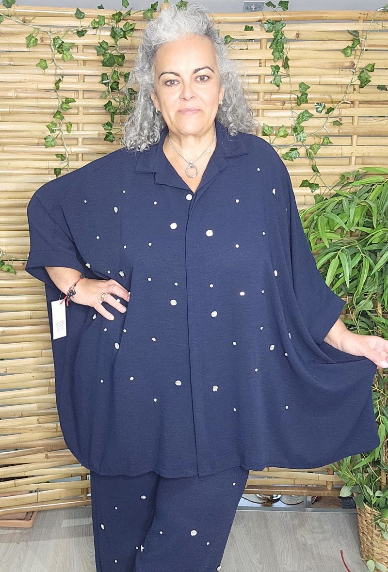 Camisa/sobrecamisa oversize, Diseño de corte rectangular holgado, de crepé de viscosa con elegante detalle de pedrería efecto diamante en la parte delantera.