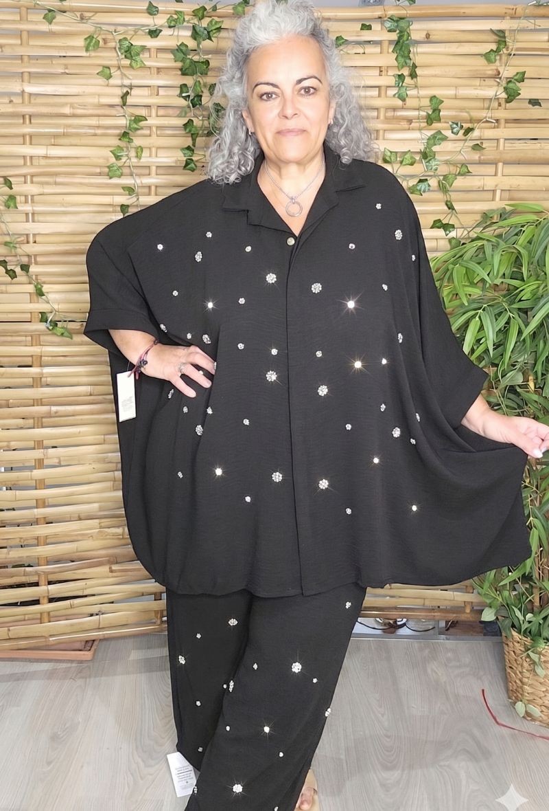 Camisa/sobrecamisa oversize, Diseño de corte rectangular holgado, de crepé de viscosa con elegante detalle de pedrería efecto diamante en la parte delantera.