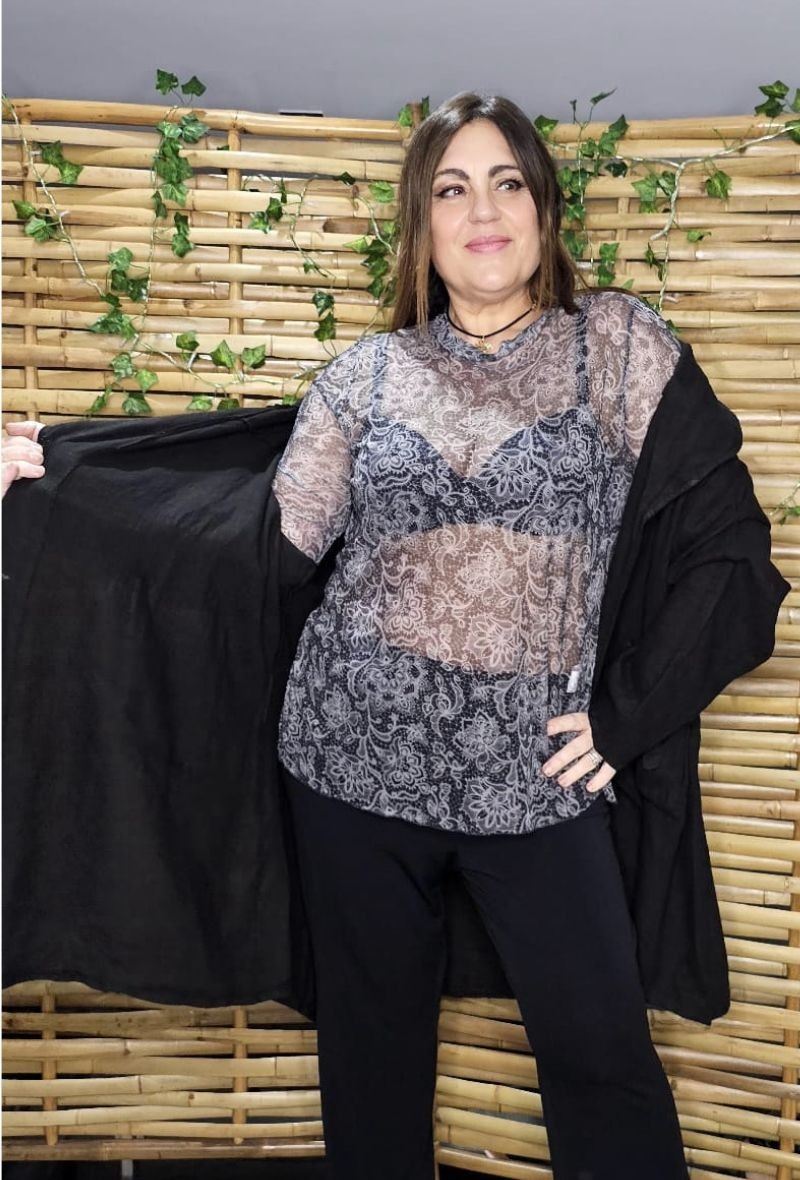 Camiseta de tul estampado con silueta ajustada, escote redondo bajo y manga francesa entallada. Una prenda femenina, moderna y con estilo.