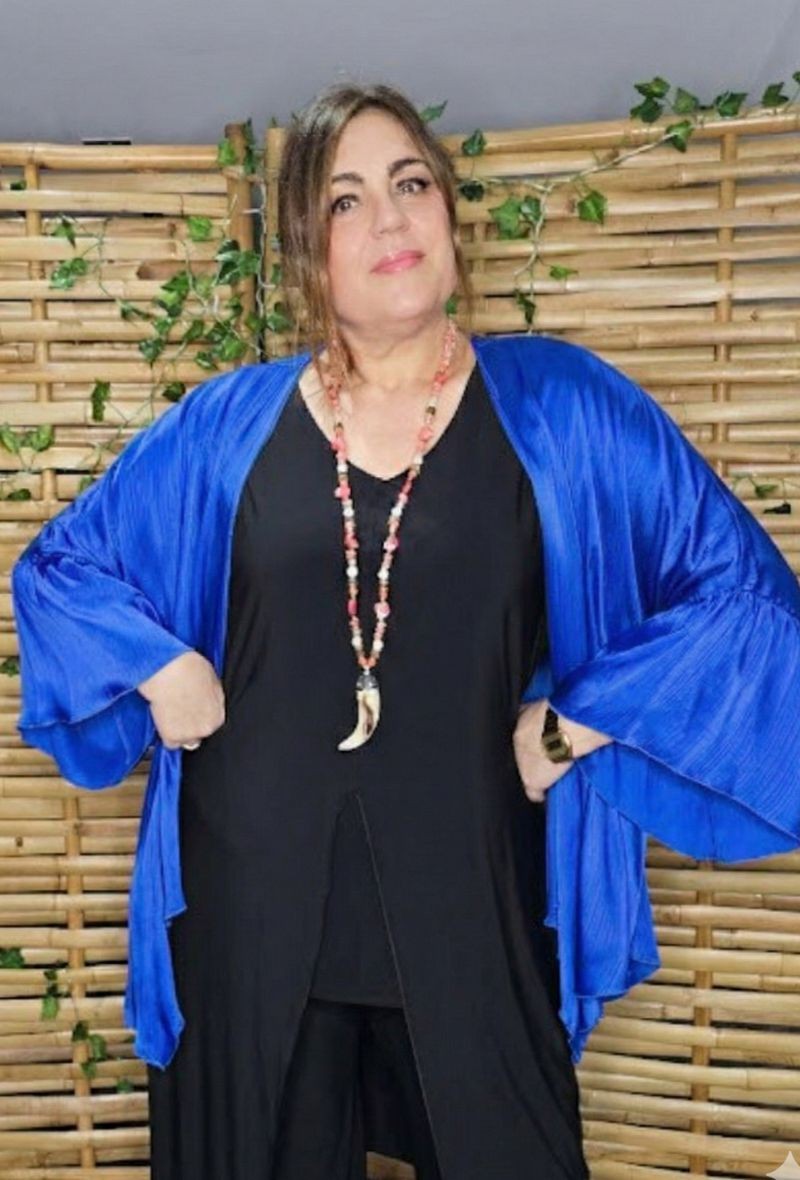 Kimono de gasa bambula satinada, ligero y fluido, con corte desigual delantero y diseño sin cierre. Elegante, versátil y perfecto para dar un toque sofisticado a cualquier look.