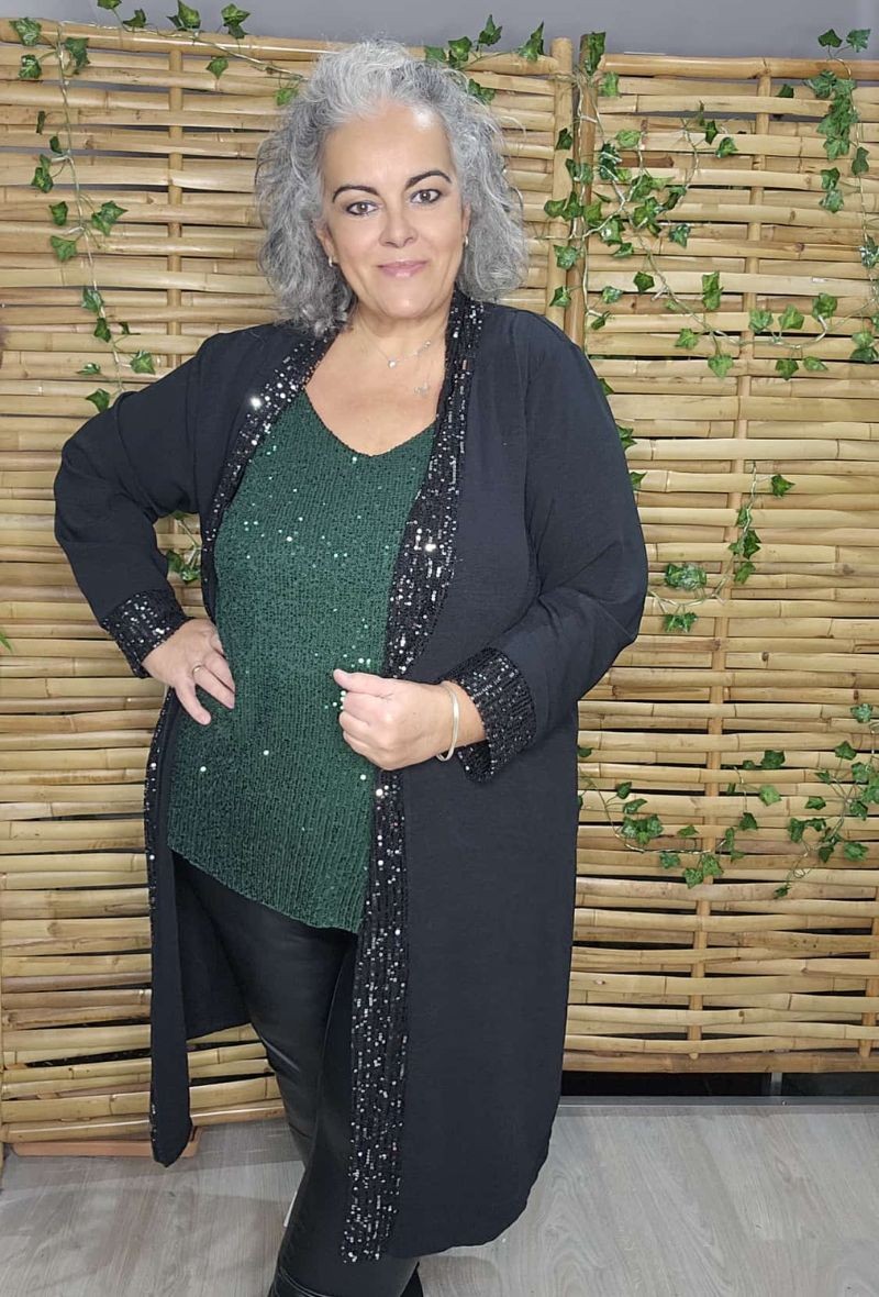 Kimono largo y abierto, sin cierre, con vivos de lentejuelas en la parte delantera. Ligero, elegante y perfecto para combinar con tus tops o blusas Princesa.