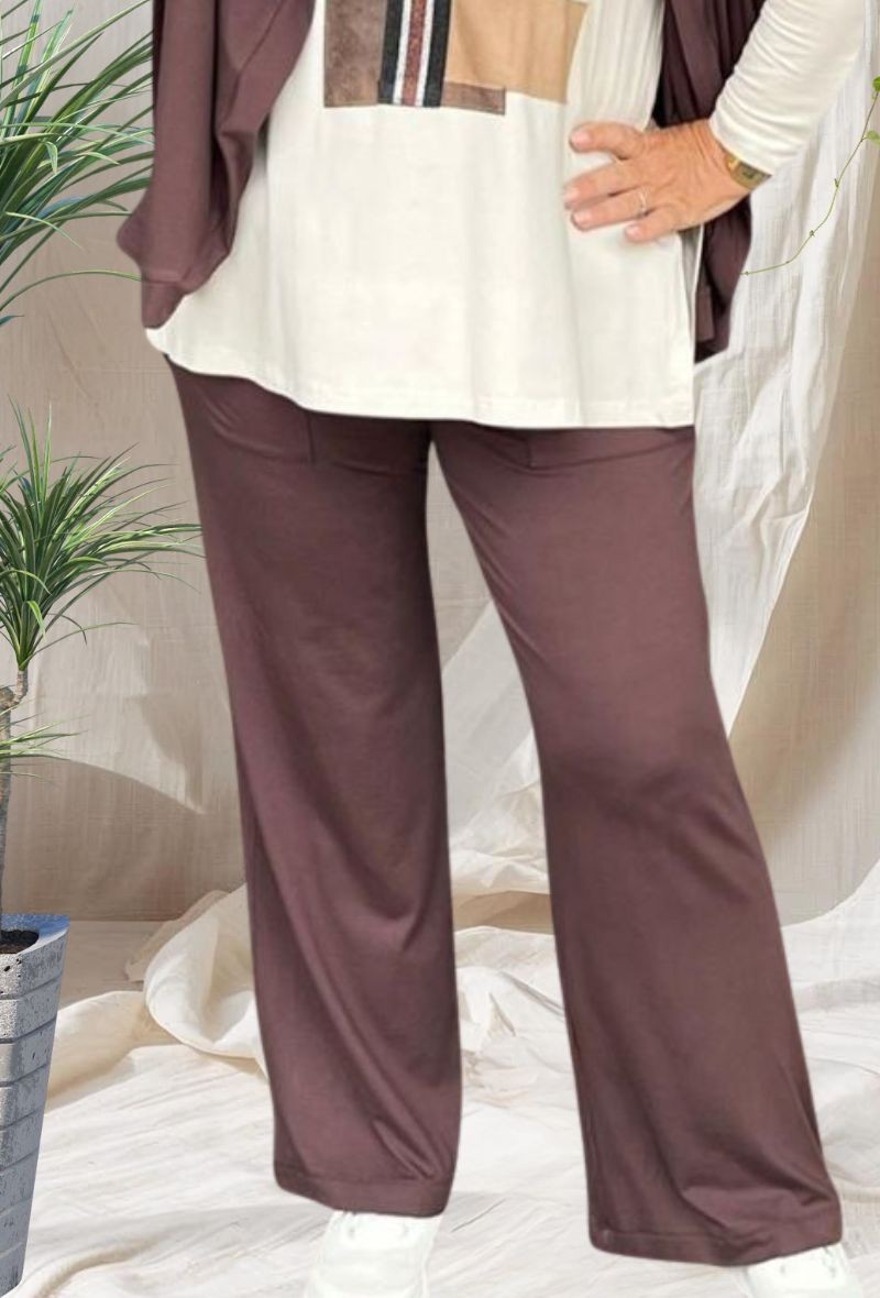 Pantalón de punto en viscosa, con 2 bolsillos y largo rectos. Mismo tejido ligero y cómodo que las camisetas, ideal para conjuntos a juego.