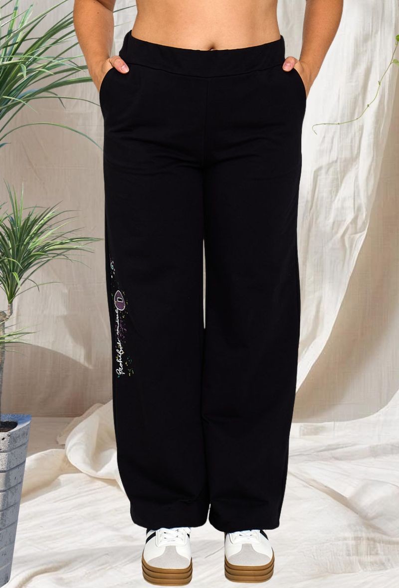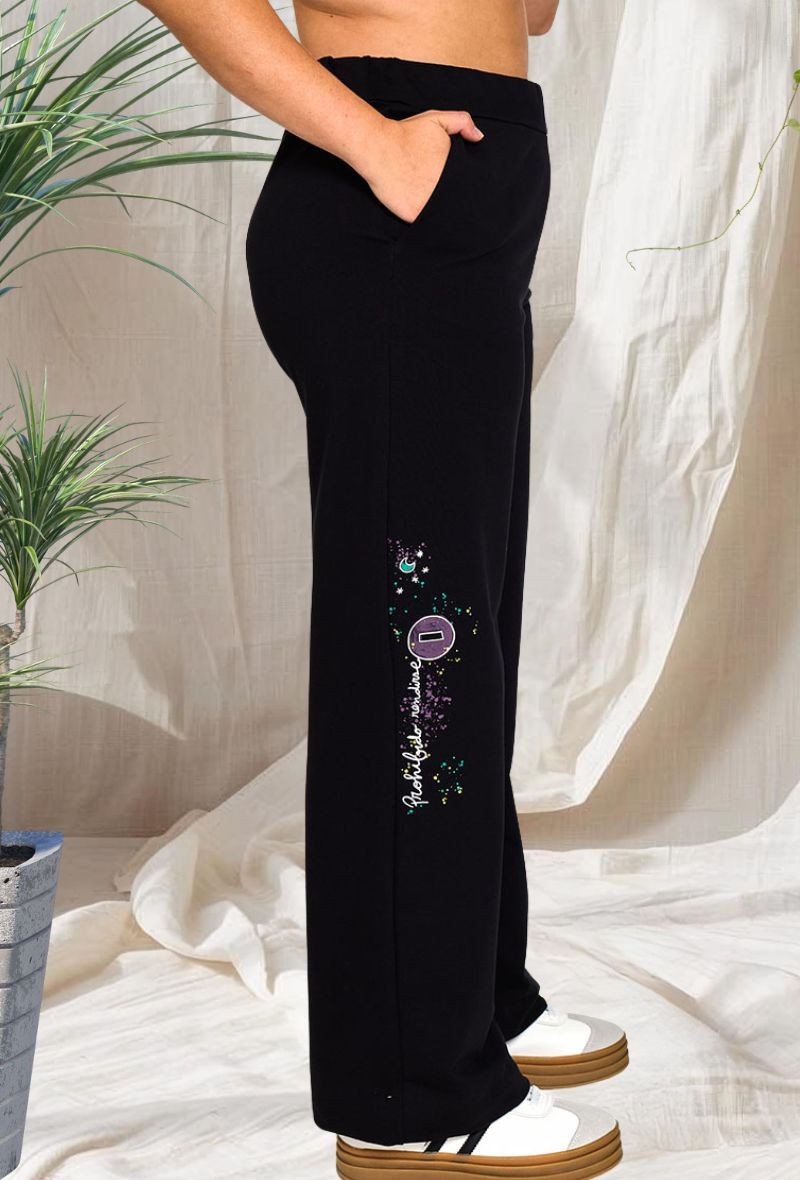 Pantalón ancho de algodón elástico con estampado lateral, cómodo y con estilo casual. Ideal para crear looks relajados con un toque moderno.