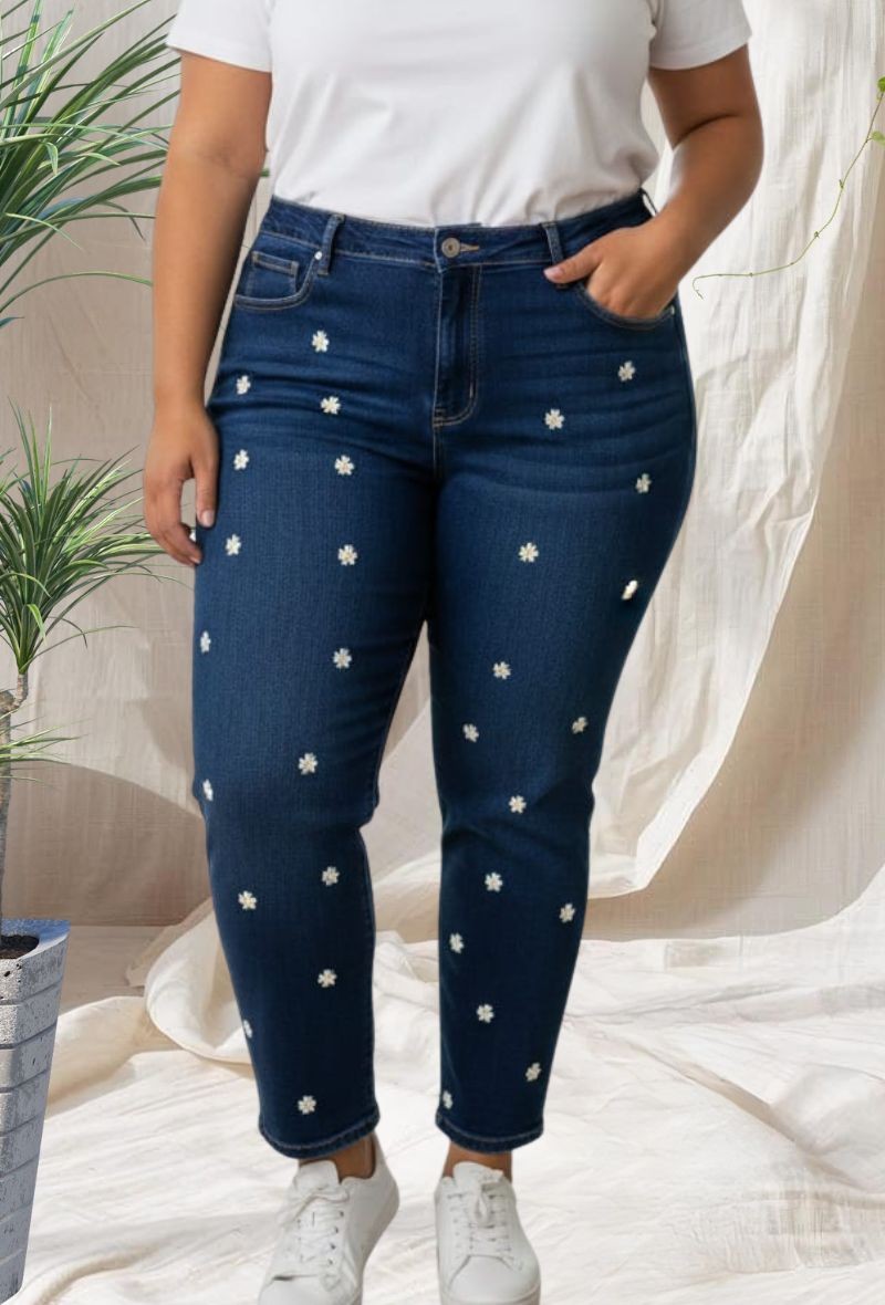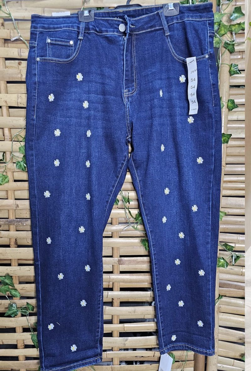 Pantalón tejano muy elástico y cómodo, con original bordado de margaritas. Diseño de corte recto, favorecedor y adaptable, ya que cede y se ajusta al cuerpo. Las tallas son francesas y dan dos tallas más que la española (ejemplo: talla 50 FR equivale a 54 ES).