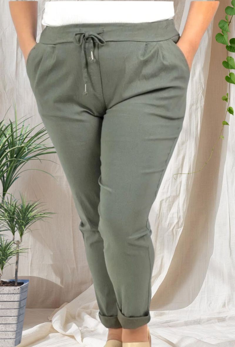 Pantalón de bengalina muy elástico, cómodo y adaptable. Diseño con cintura elástica y cordón ajustable, bolsillos laterales y bajo ligeramente remangado. Favorece y se adapta sin marcar. Disponible en diferentes colores.