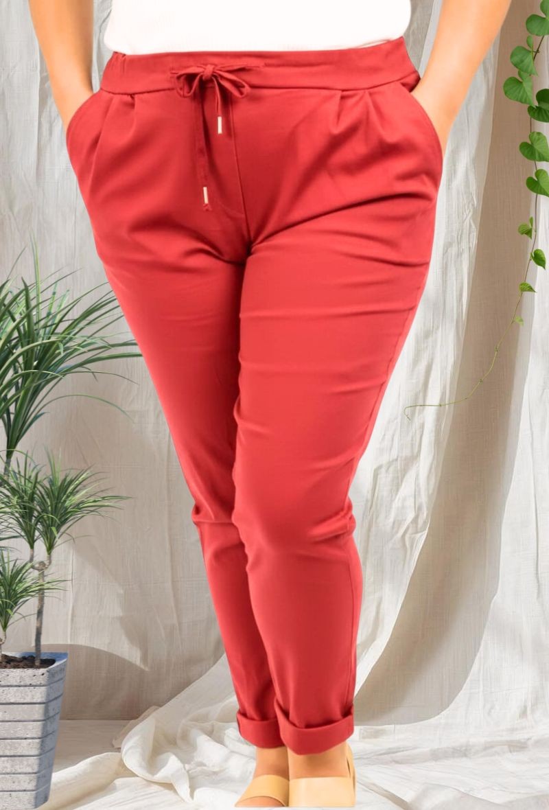 Pantalón de bengalina muy elástico, cómodo y adaptable. Diseño con cintura elástica y cordón ajustable, bolsillos laterales y bajo ligeramente remangado. Favorece y se adapta sin marcar. Disponible en diferentes colores.