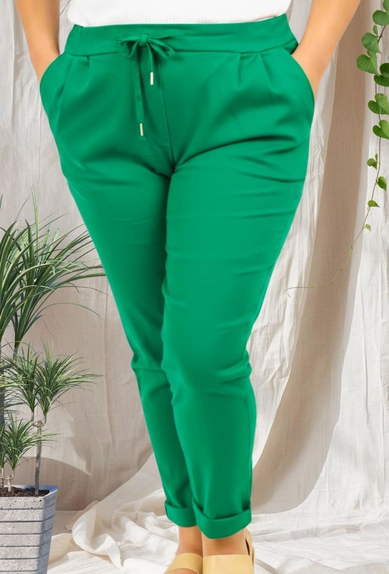 Pantalón de bengalina muy elástico, cómodo y adaptable. Diseño con cintura elástica y cordón ajustable, bolsillos laterales y bajo ligeramente remangado. Favorece y se adapta sin marcar. Disponible en diferentes colores.