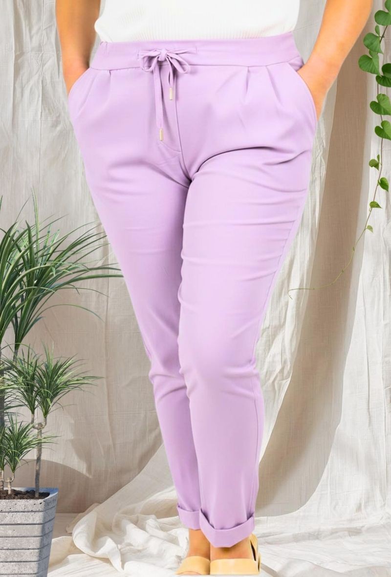 Pantalón de bengalina muy elástico, cómodo y adaptable. Diseño con cintura elástica y cordón ajustable, bolsillos laterales y bajo ligeramente remangado. Favorece y se adapta sin marcar. Disponible en diferentes colores.