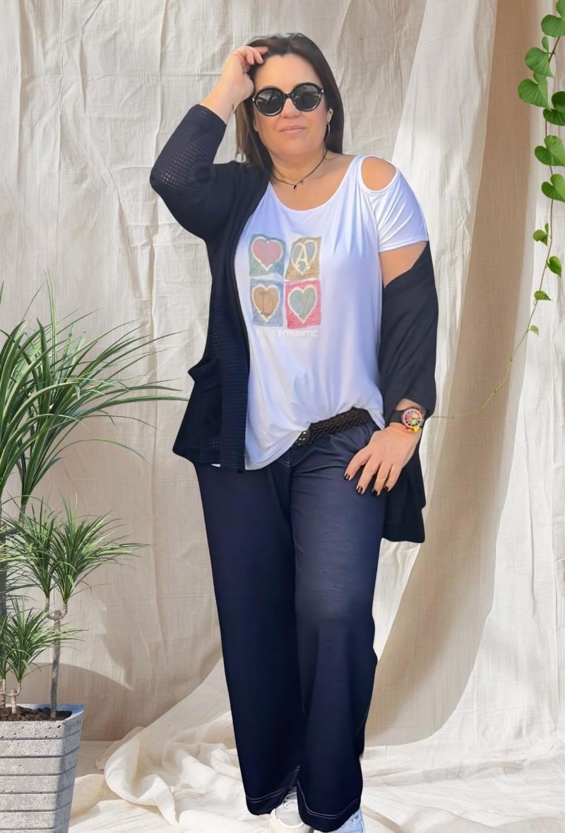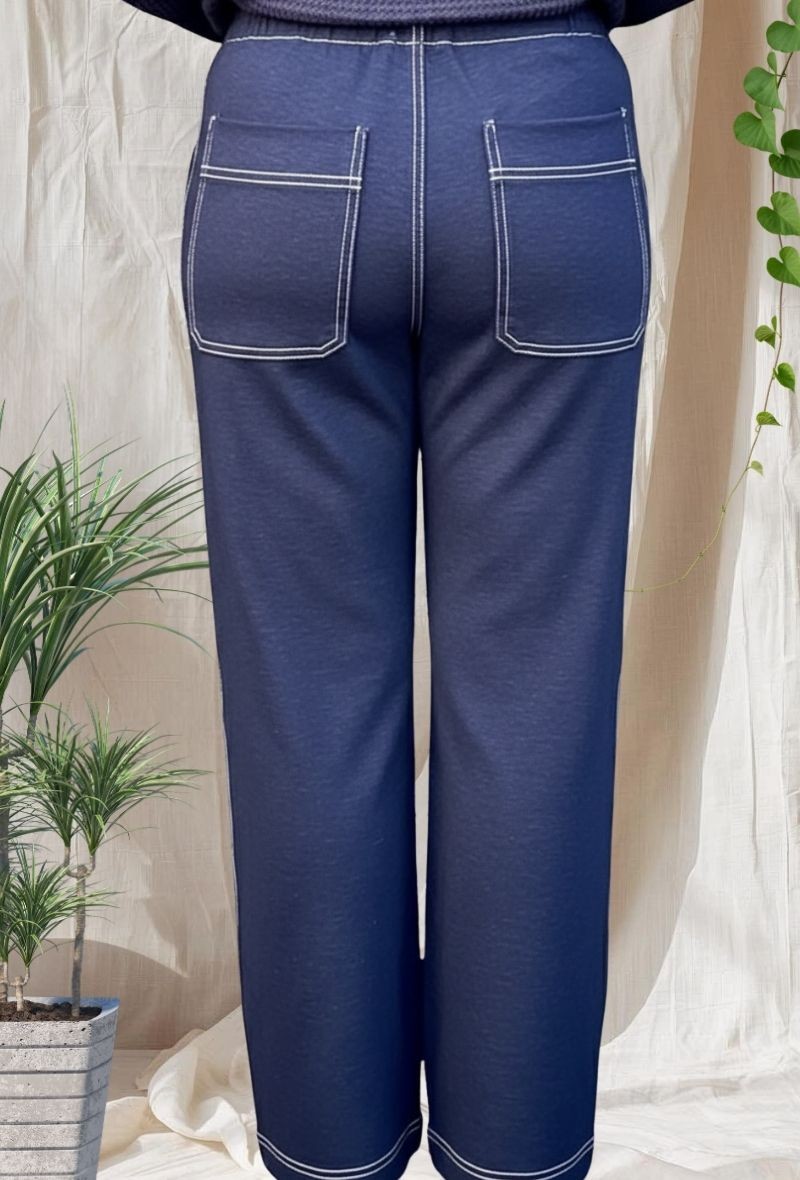 Pantalón de punto efecto tejano de la colección Indra, increíblemente elástico y comodísimo. Corte recto con cintura elástica y cordón ajustable, bolsillos laterales y bolsillos traseros de parche. Ideal para ir arreglada pero con sensación de chándal (y eso nos encanta 😉).