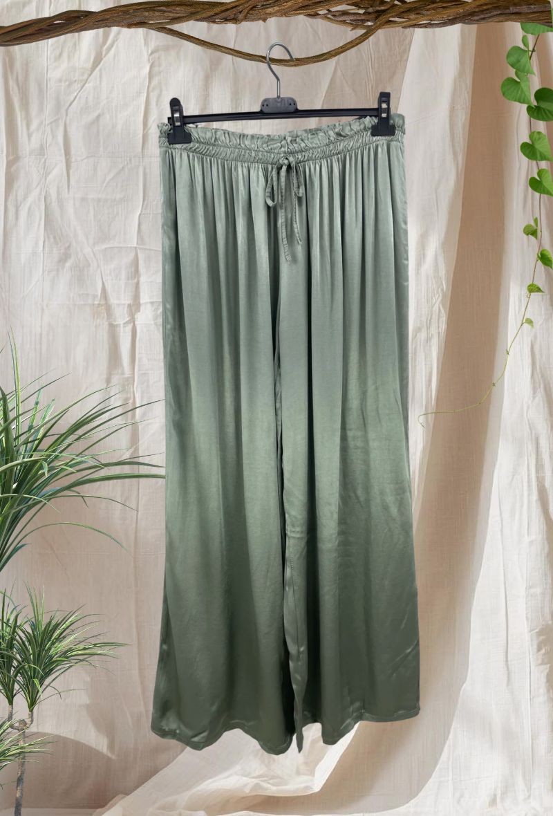 Pantalón fluido de viscosa satinada 100% con caída suave y elegante. Diseño amplio y cómodo que aporta movimiento y estiliza la silueta. Perfecto para crear conjuntos elegantes o looks relajados con blusas y camisetas.