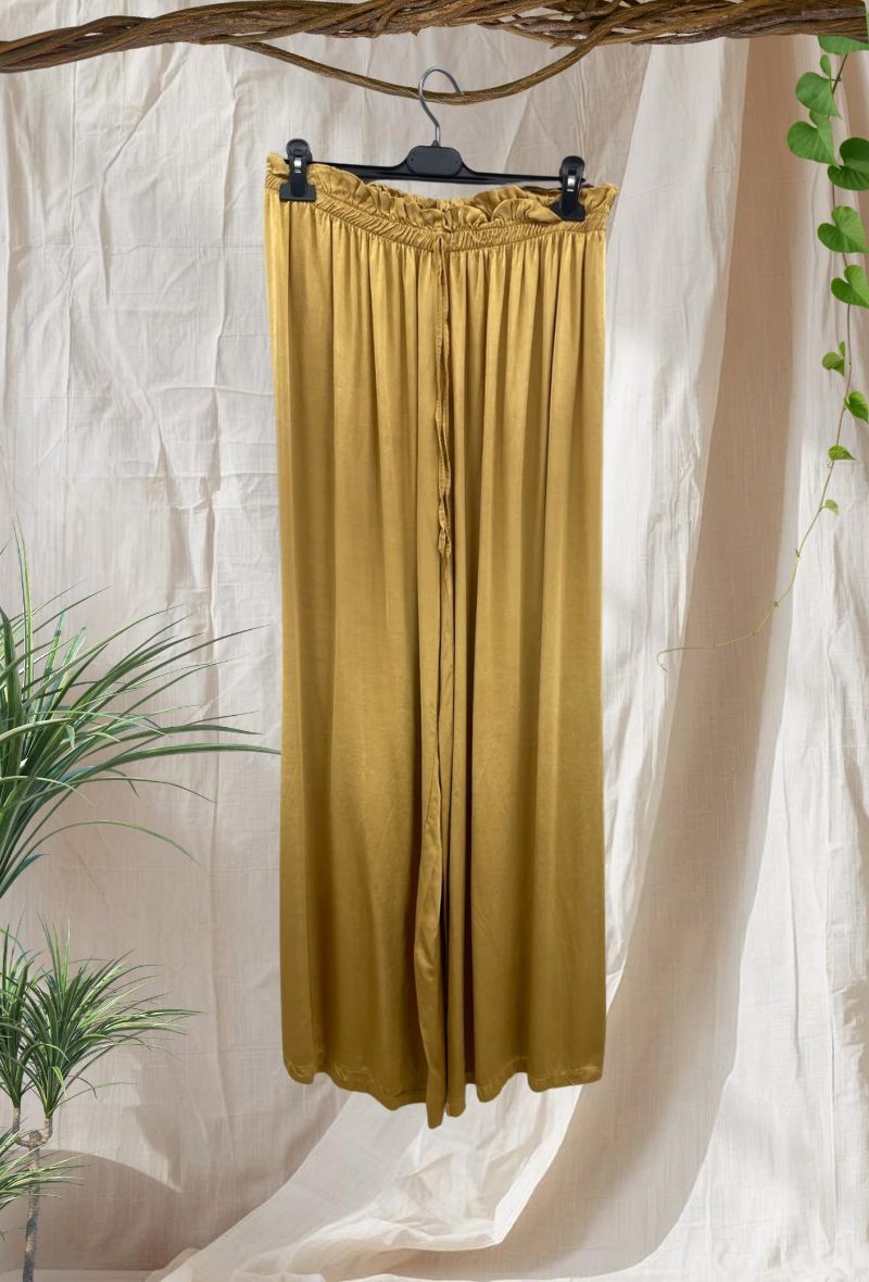 Pantalón fluido de viscosa satinada 100% con caída suave y elegante. Diseño amplio y cómodo que aporta movimiento y estiliza la silueta. Perfecto para crear conjuntos elegantes o looks relajados con blusas y camisetas.