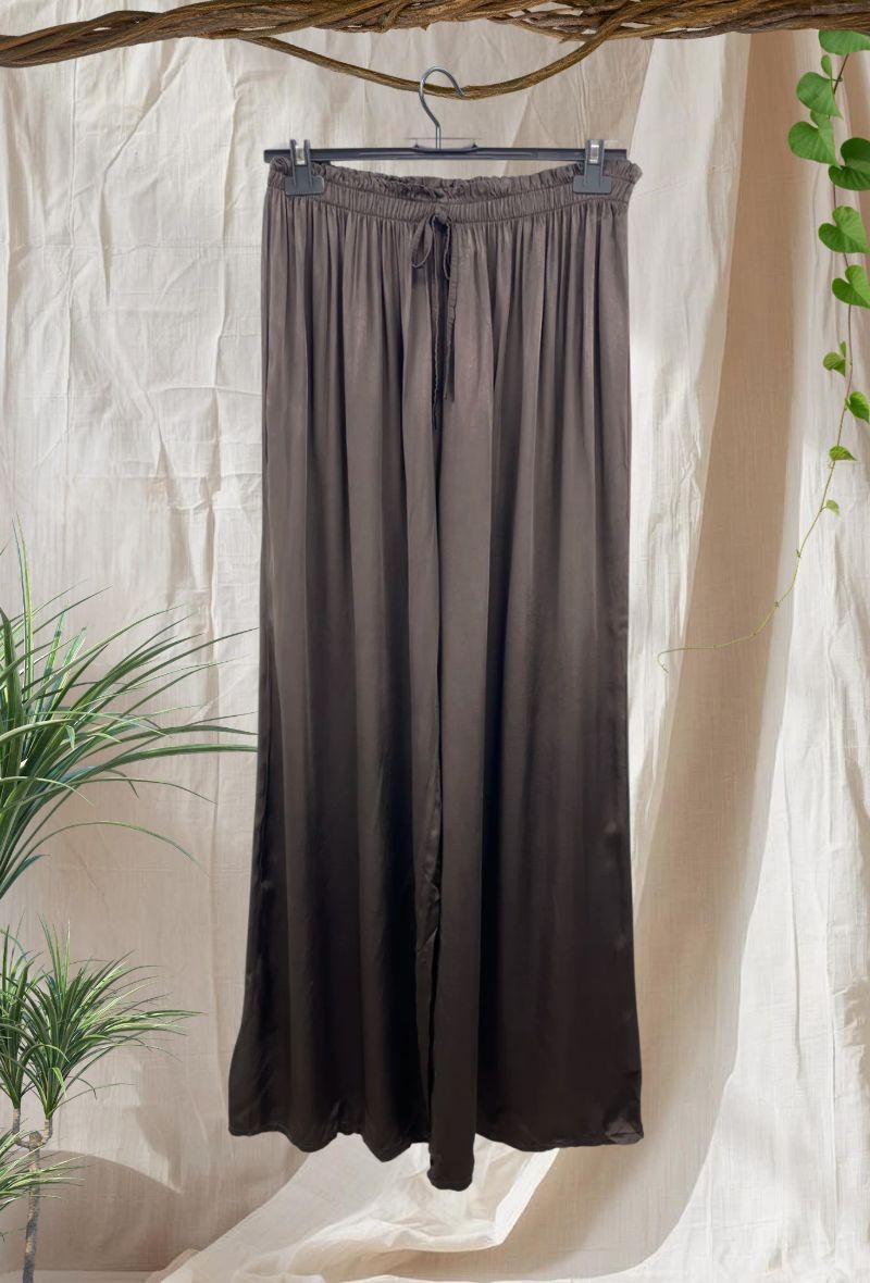 Pantalón fluido de viscosa satinada 100% con caída suave y elegante. Diseño amplio y cómodo que aporta movimiento y estiliza la silueta. Perfecto para crear conjuntos elegantes o looks relajados con blusas y camisetas.