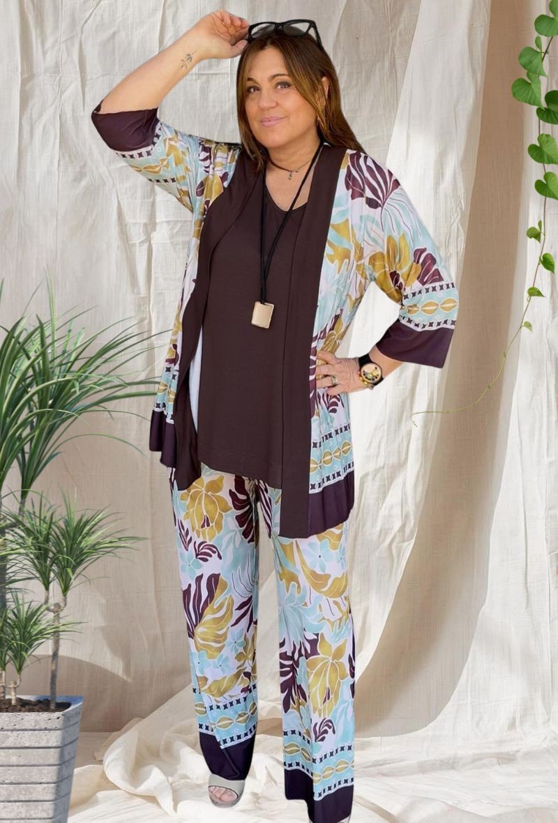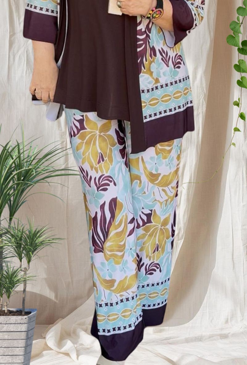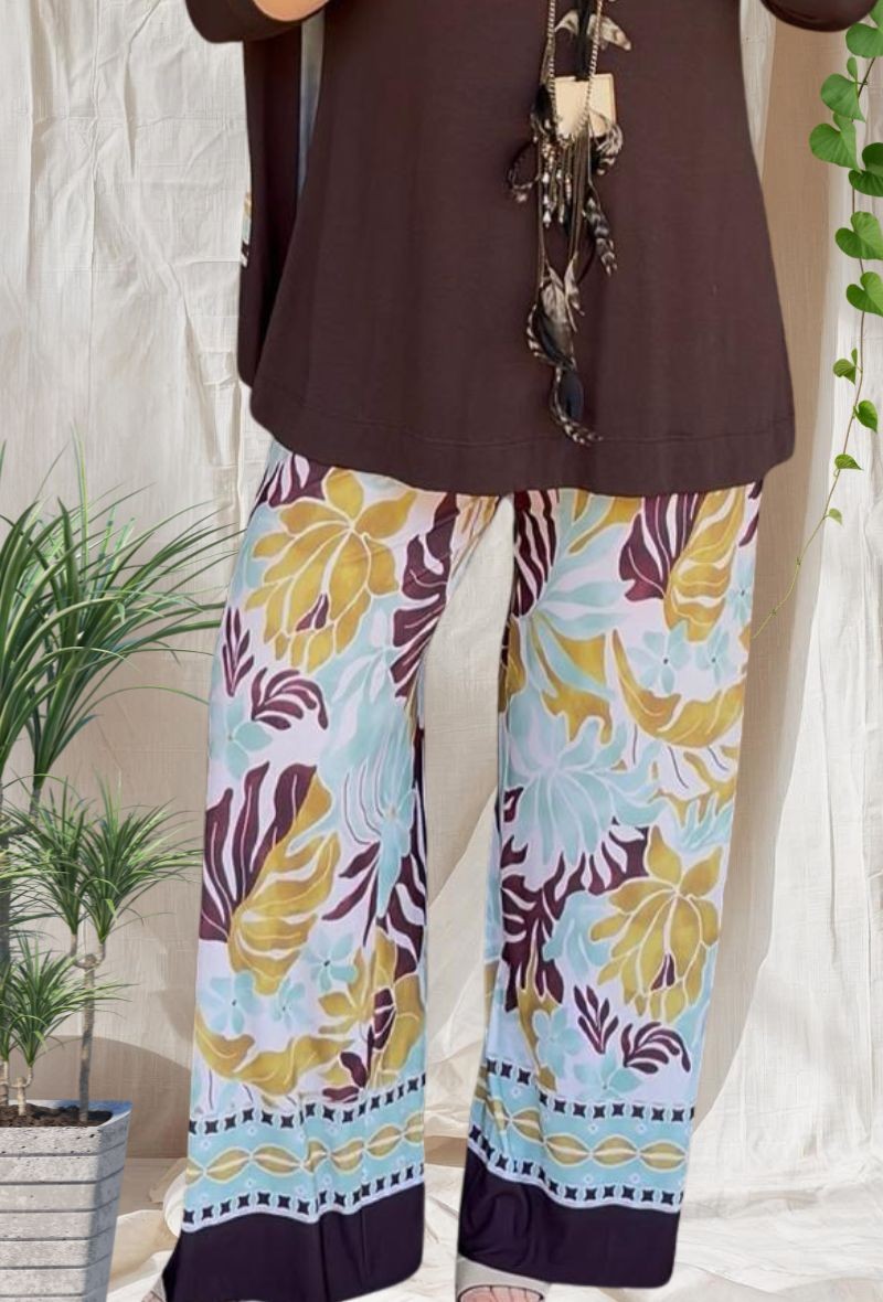 Pantalón amplio de punto frío de la colección Indra, con caída fluida y estampado elegante. Diseño cómodo, fresco y muy favorecedor. Ideal para llevar con su chaqueta a juego o combinar con básicos.