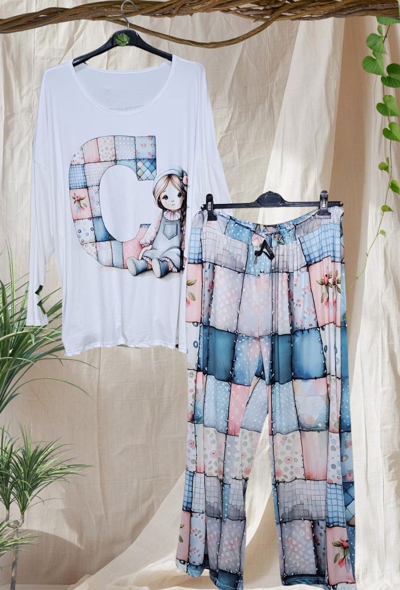Pijama de tacto super suave, compuesto por pantalón largo y camiseta de manga larga con cuello redondo. Con estampados alegres y cómodos, es perfecto para descansar con estilo y comodidad.