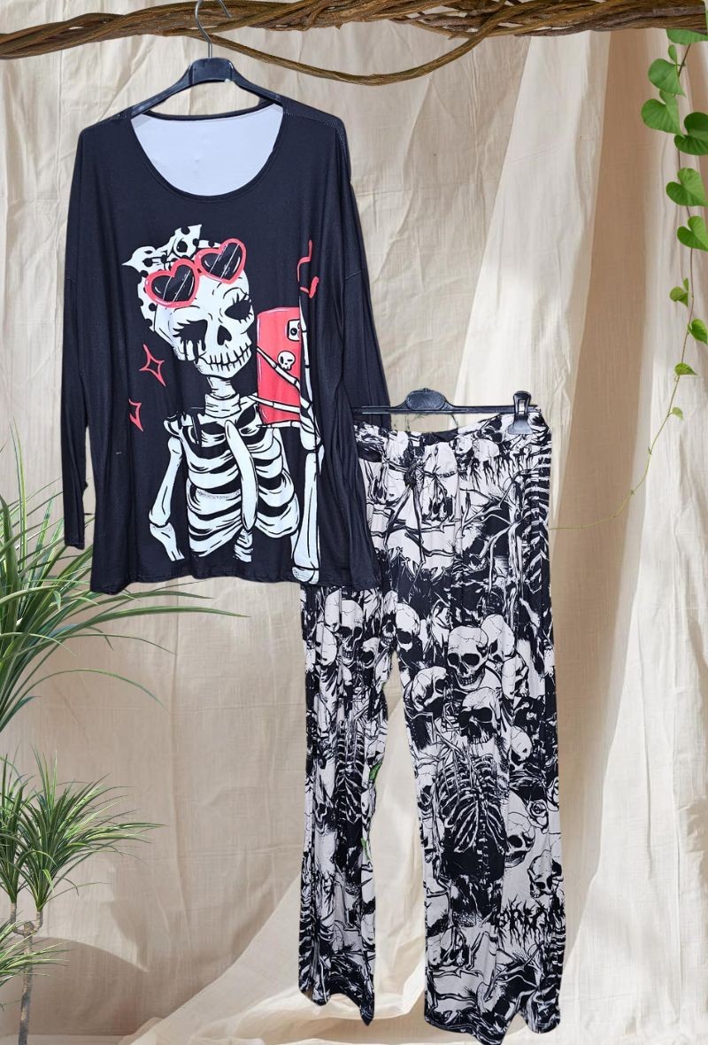 Pijama de tacto super suave, compuesto por pantalón largo y camiseta de manga larga con cuello redondo. Con estampados alegres y cómodos, es perfecto para descansar con estilo y comodidad.