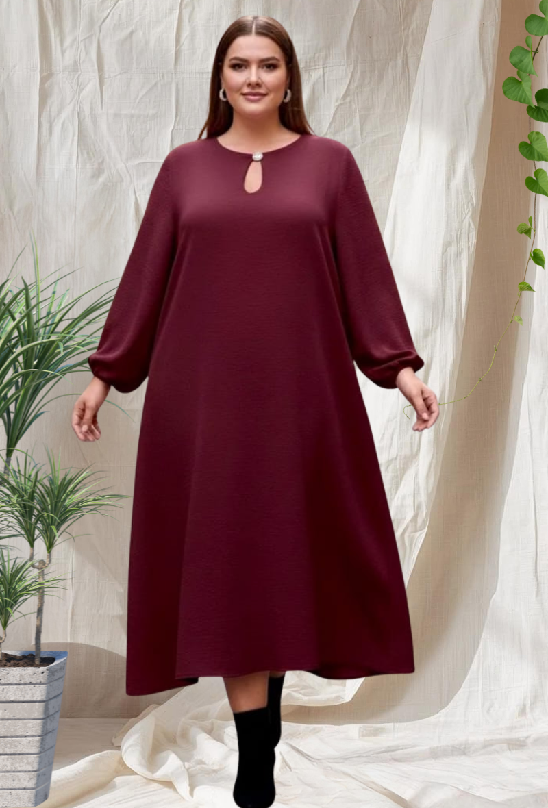 Vestido largo de crepé de viscosa suave con escote de lágrima y botón decorativo de pedrería. Corte evasé con bajo ligeramente acampanado y mangas abullonadas con puños elásticos. Elegante, fluido y muy favorecedor.