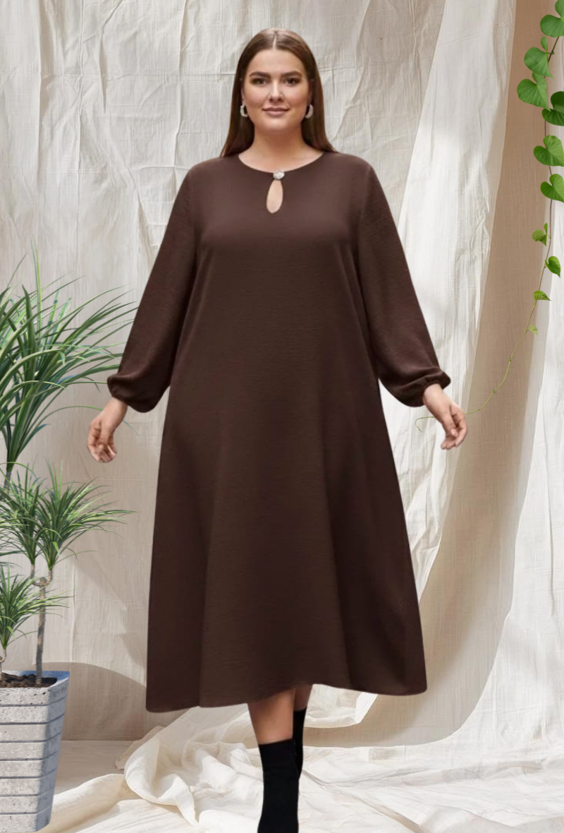 Vestido largo de crepé de viscosa suave con escote de lágrima y botón decorativo de pedrería. Corte evasé con bajo ligeramente acampanado y mangas abullonadas con puños elásticos. Elegante, fluido y muy favorecedor.