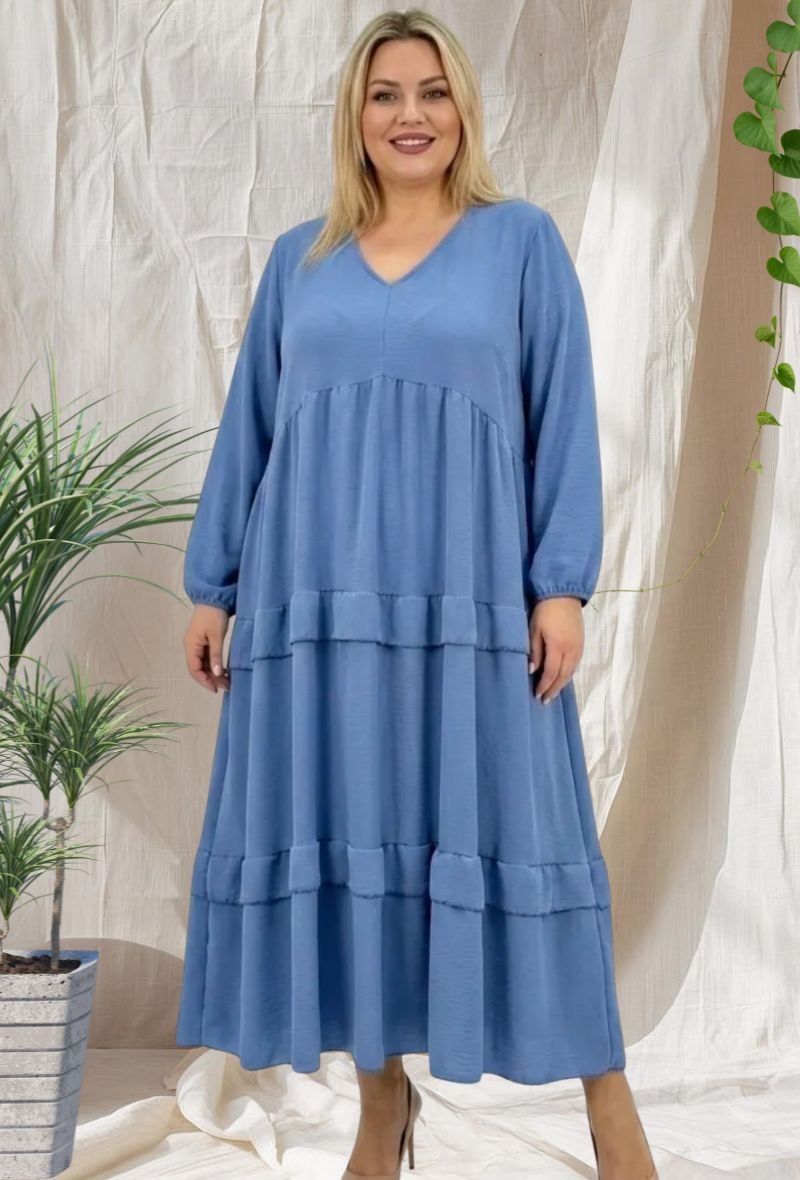 Vestido largo estilo babydoll en crepé de viscosa suave y ligero. Diseño con cuello en V con volante y efecto superpuesto, mangas ligeramente abullonadas con puños elásticos y corte en A con vuelo en el bajo que aporta movimiento y comodidad. Disponible en diferentes colores y en 2 tallas: