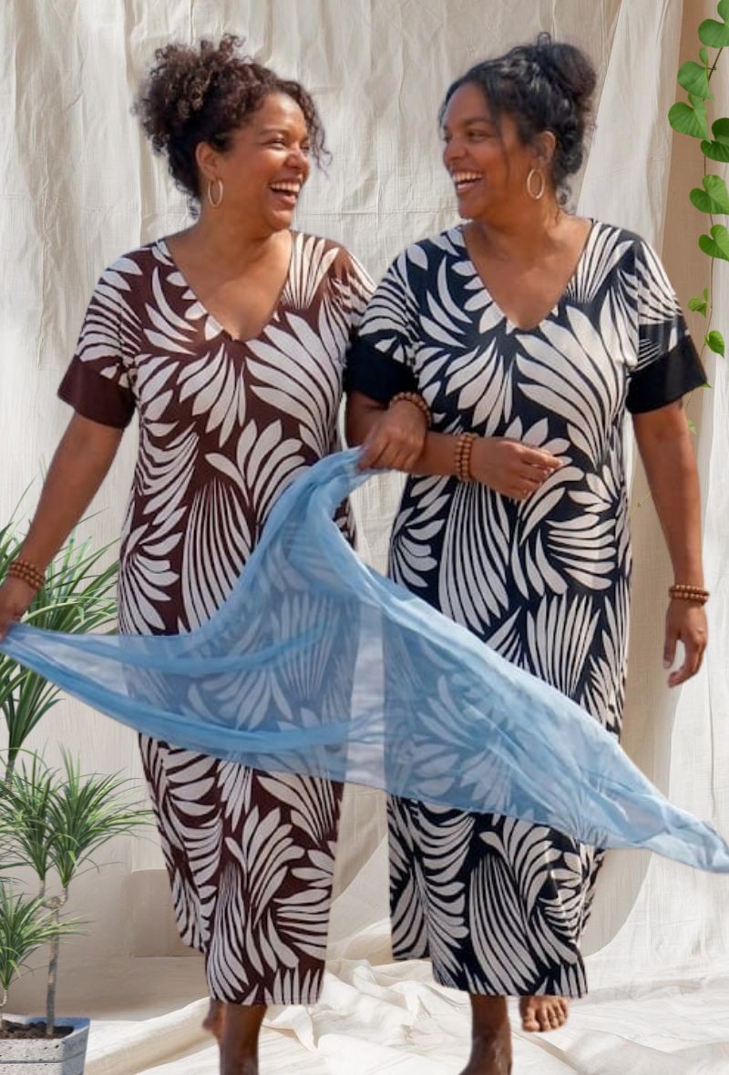 Vestido largo con estampado elegante, manga corta y bolsillos laterales. Tejido suave con caída fluida que no marca y aporta comodidad durante todo el día.